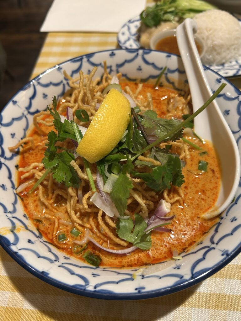 私のカオソイは、濃厚で甘いココナッツたっぷりのカレールーに、モチモチの麺とパリパリの揚げ麺、そして大きな鶏肉がゴロゴロ!パクチーとの相性も抜群で、今まで食べたことのない美味しさでした。